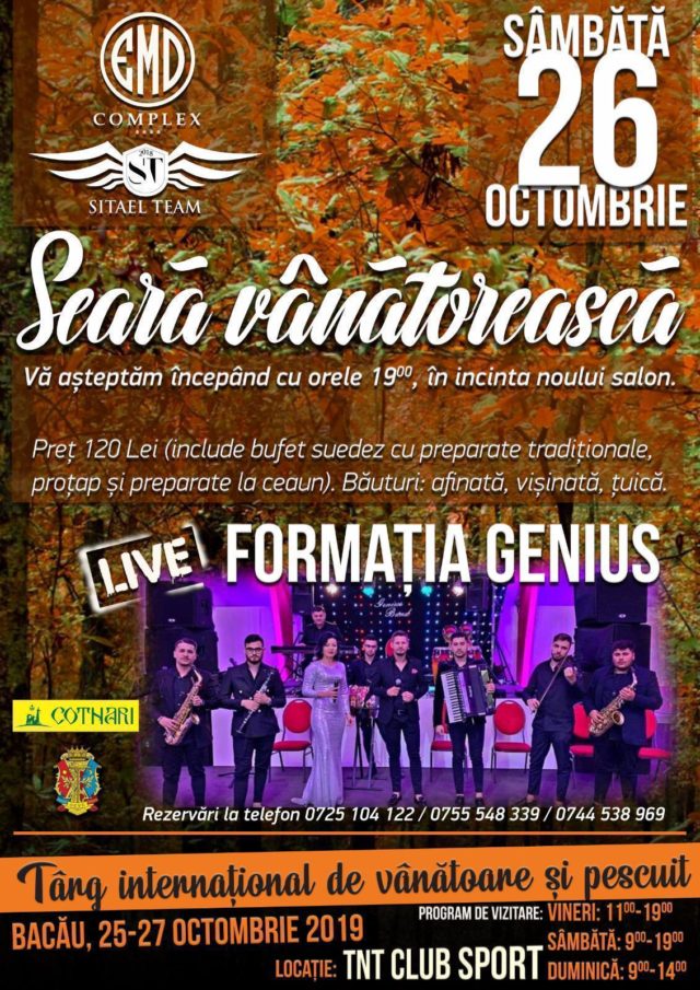 • Seară vânătorească la Hotel-Restaurant „EMD”, din Bacău, adresată tuturor doritorilor, pe bază de rezervare, începând cu ora 19.00. Meniu vânătoresc, prezentări și degustări de vinuri. Eveniment susținut și de Domeniile Cotnari.
