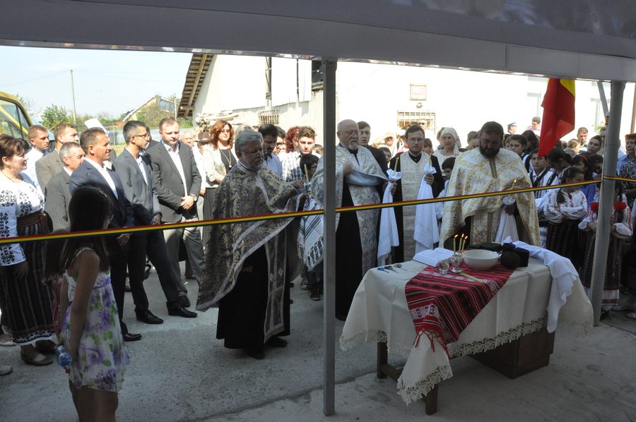 Slujba de sfintire a fost oficiata de un sobor de preoti avându-l in frunte pe Ion Palura, parintele paroh. Panglica tricolora a fost taiata de Petru Dochiei, Dragos Benea si Dorian Pocovnicu. Primarul le-a urat „La multi ani” tuturor Mariilor din comuna, apoi a vorbit despre noul obiectiv.