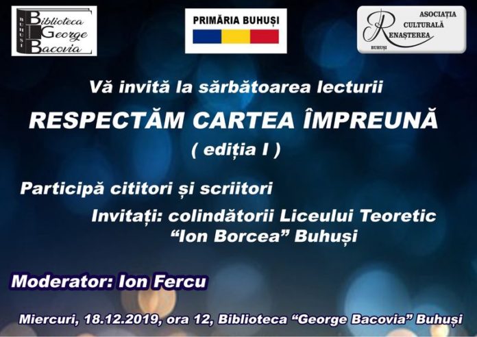 Biblioteca „George Bacovia” Buhuși îi invită pe cititori, în ziua de 18 decembrie 2019, începând cu ora 12.00, la o sărbătoare a lecturii: „Respectăm Cartea Împreună”. Dezbaterea nonconformistă despre aventurile lecturii va avea nu doar accentele unor scriitori invitați, ci, mai ales, pe cele ale cititorilor pasionați, prieteni ai Bibliotecii. Nu vor lipsi surprizele prin care cititorilor li se va mulțumi pentru respectul manifestat pentru Carte. Colindătorii de la Liceul Teoretic „Ion Borcea”, coordonați de prof. preot Mihai Macovei, vor prefața magia spiritului Crăciunului. Întâlnirea de suflet este susținută de Primăria Buhuși, Asociația Culturală „Renașterea” și diferiți sponsori.