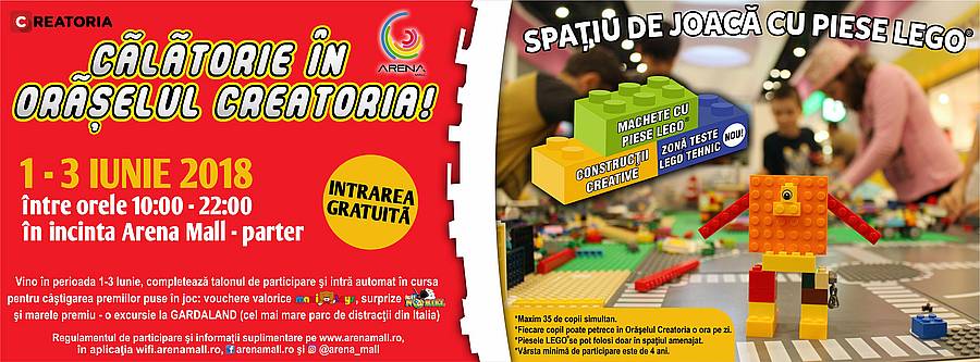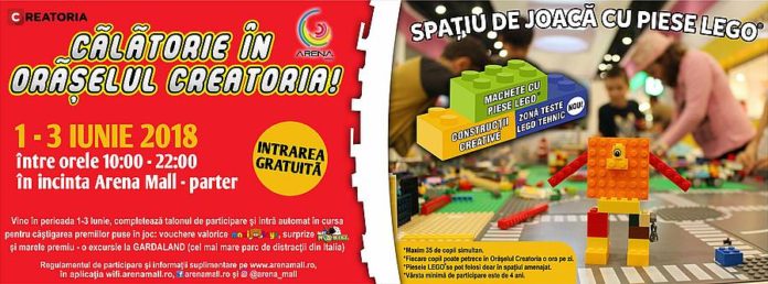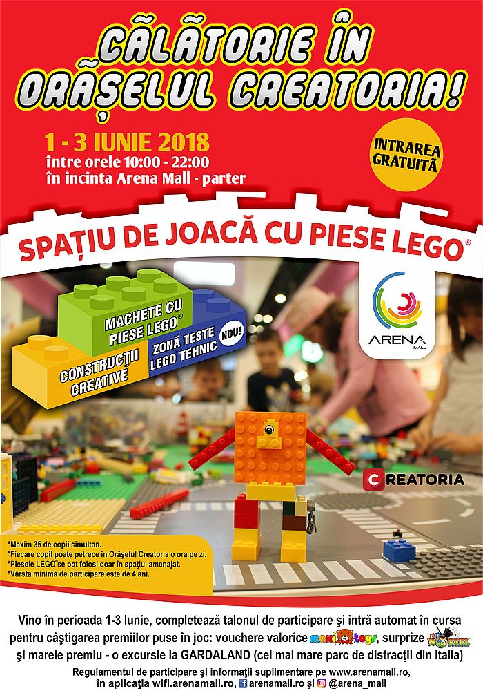 Dragi părinți și copii, Arena Mall vă invită într-o „Călătorie în Orășelul Creatoria!” în perioada 1–3 iunie. Cei mici sunt invitați să experimenteze bucuria jocurilor LEGO, într-un cadru organizat și coordonat.