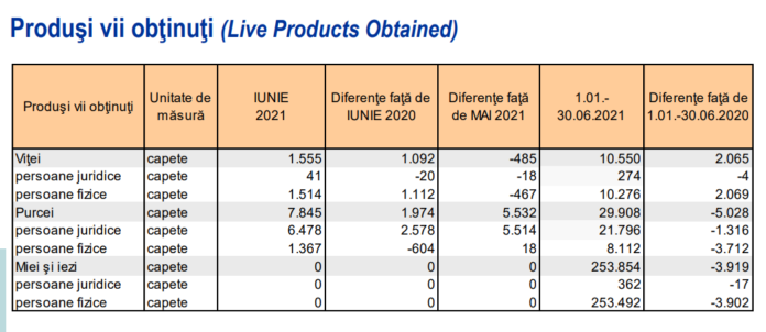 Conform InfoStat, fața de 30 iunie 2020 se remarcă o scădere cu 2.725 a numărului de bovine, cu 1.387 a numărului de porci dar o creștere cu 20.990 a numărului de capre și oi precum și cu 1,3 milioane a numărului de păsări.