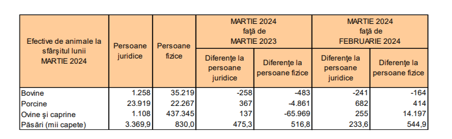 La păsări, efectivele au crescut semnificativ, ajungând la 4.199,9 mii capete, cu 992,1 mii capete mai mult decât la sfârșitul lunii martie 2023. Persoanele juridice au înregistrat o creștere de 475,3 mii capete, iar persoanele fizice au avut o creștere de 516,8 mii capete. Față de luna februarie 2024, numărul de păsări a crescut cu 233,6 mii capete la persoanele juridice și cu 544,9 mii capete la persoanele fizice.
