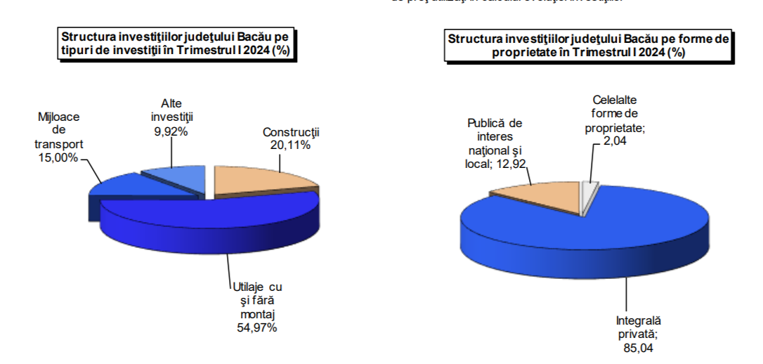 Aceste date reflectă o schimbare semnificativă în structura și volumul investițiilor din județul Bacău, indicând o scădere generală a acestora, dar și o redistribuire a fondurilor către achiziția de utilaje în detrimentul lucrărilor de construcții.
