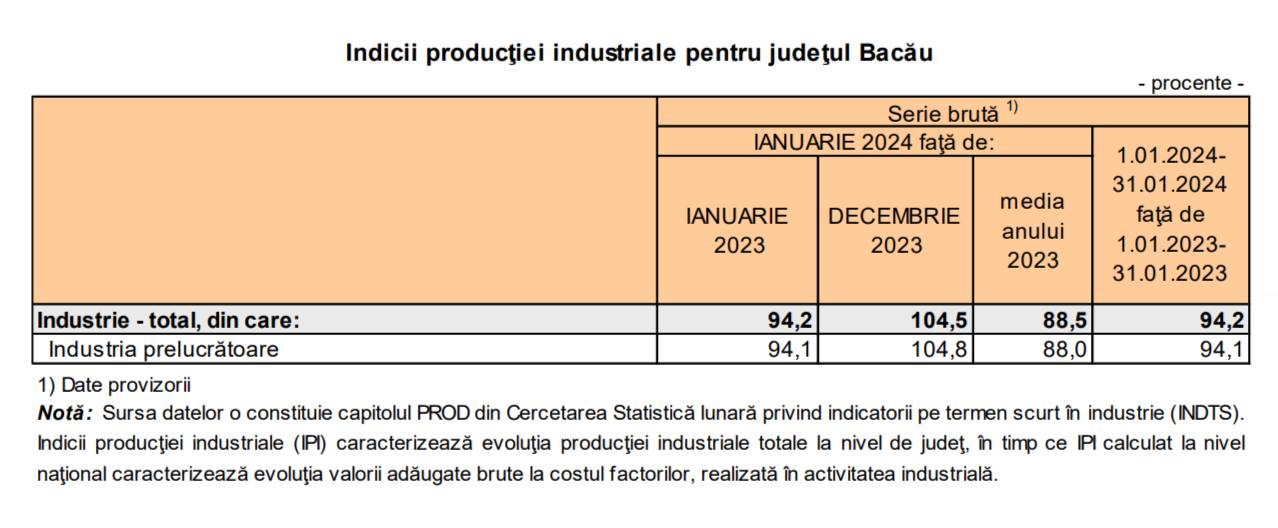 Potrivit datelor furnizate de Direcția Județeană de Statistică Bacău, producția industrială în județul Bacău în luna ianuarie 2024 a înregistrat o scădere semnificativă, în comparație cu luna similară din anul precedent și cu media anului 2023. Această evoluție a ridicat semne de întrebare cu privire la sustenabilitatea și reziliența sectorului industrial local.