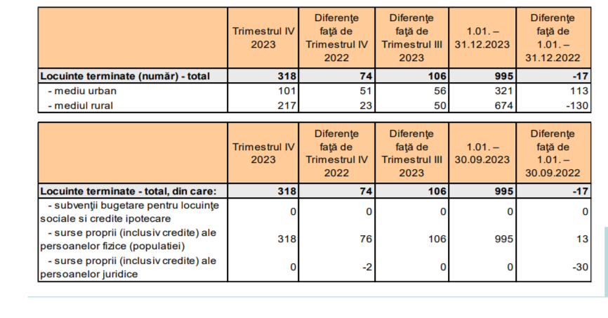 În trimestrul IV al anului 2023, au fost finalizate 318 locuințe, cu 74 mai multe decât în același trimestru al anului precedent și cu 106 mai multe decât în trimestrul III al anului 2023. Dintre acestea, 101 locuințe au fost finalizate în mediul urban și 217 în mediul rural.