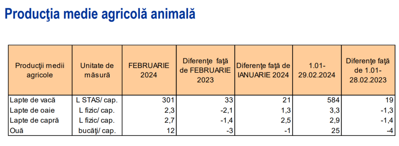 Lapte de vacă: În februarie 2024, producția medie de lapte de vacă, măsurată în litri conform standardelor STAS pe cap de animal, a fost de 301 litri, în creștere cu 33 litri față de aceeași perioadă din 2023. În perioada ianuarie-februarie 2024, această tendință ascendentă a fost susținută, cu o creștere de 19 litri în comparație cu aceeași perioadă din 2023.
