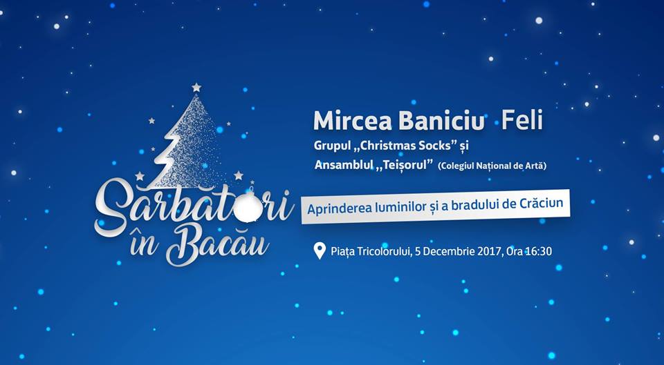 Marți, 5 Decembrie, începând cu ora 16:30, în Piața Tricolorului, va avea loc spectacolul dedicat ceremoniei de aprindere a luminilor și bradului de Crăciun din Bacău.