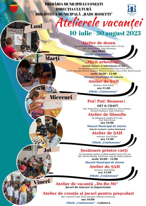 Biblioteca Municipală „Radu Rosetti” din Onești deschide, luni, 10 iulie, atelierele pentru copii. Acestea vor fi organizate la Muzeul de Istorie și la Filiala Cosânzeana a bibliotecii, pentru că sediul ei central se află, în acest an, în reabilitare și modernizare.