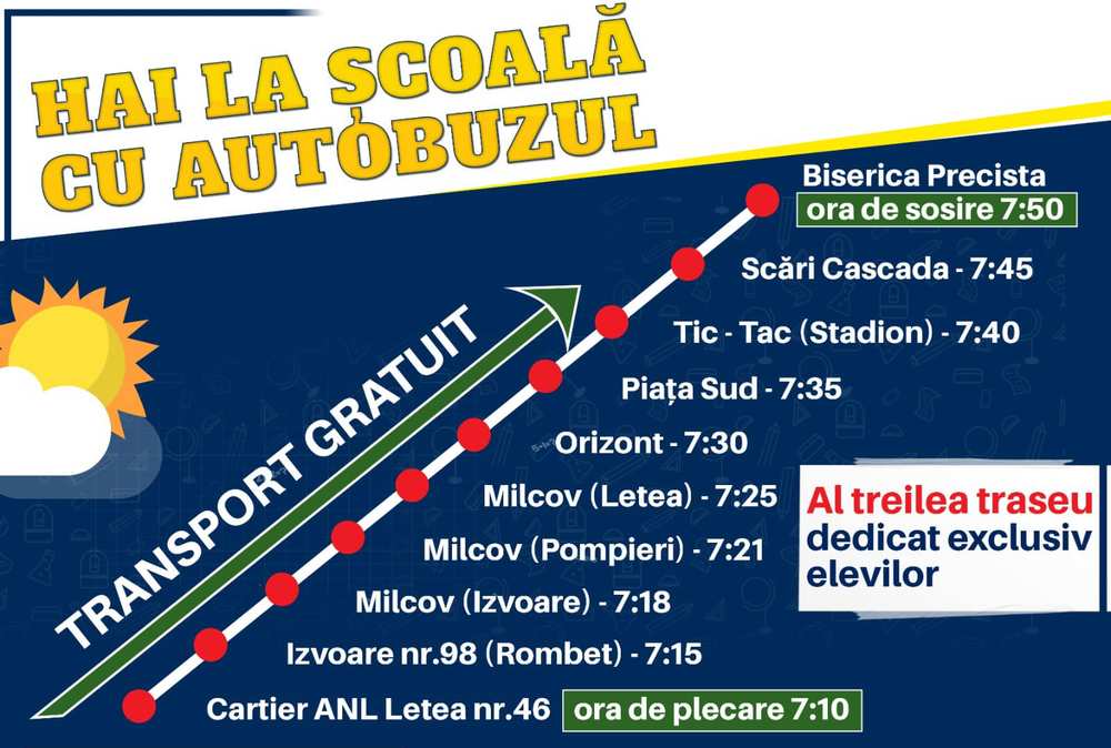 Cu scopul de a facilita accesul elevilor la școli și licee, noul autobuz școlar va începe să circule pe un traseu nou, începând cu data de 22 ianuarie, conform următorului program: