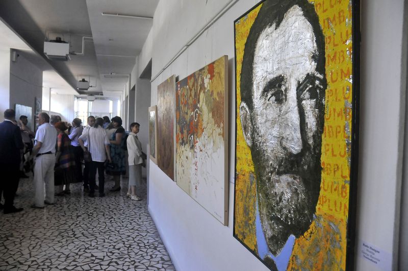Moinesteanul Dumitru Macovei, intr-o tinuta sport, era cautat insistent de colegii din tara, Dionis Puscuta, presedinte al UAP Bacau punea la punct ultimele detalii inainte de vernisaj, impreuna cu Mariana Popa, director al complexului Muzeal “Iulian Antonescu”, gazda si organizator al acestei editii a “Saloanelor…”.