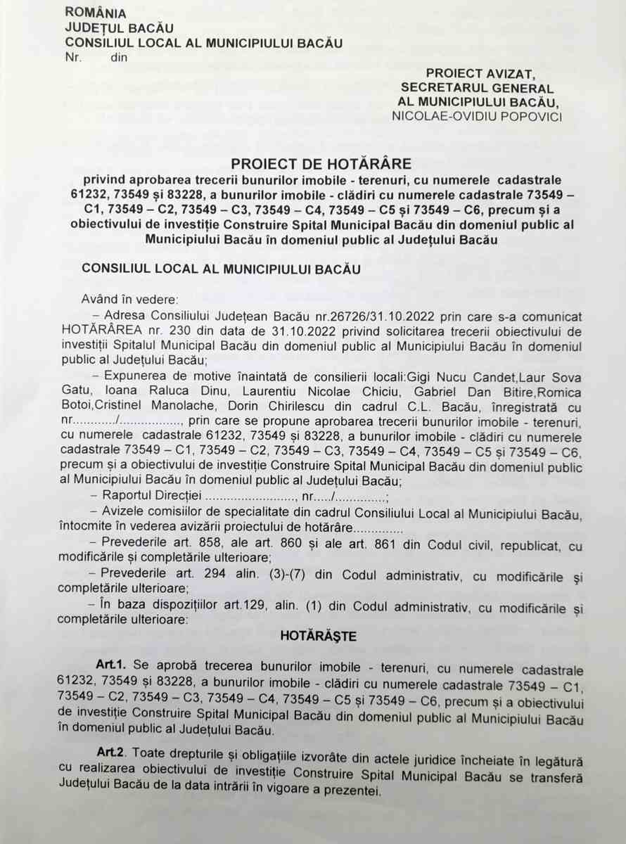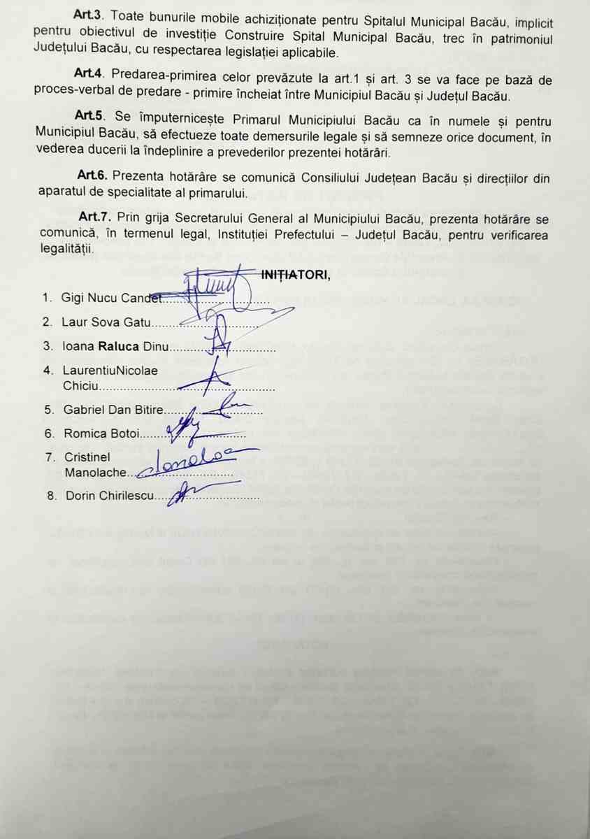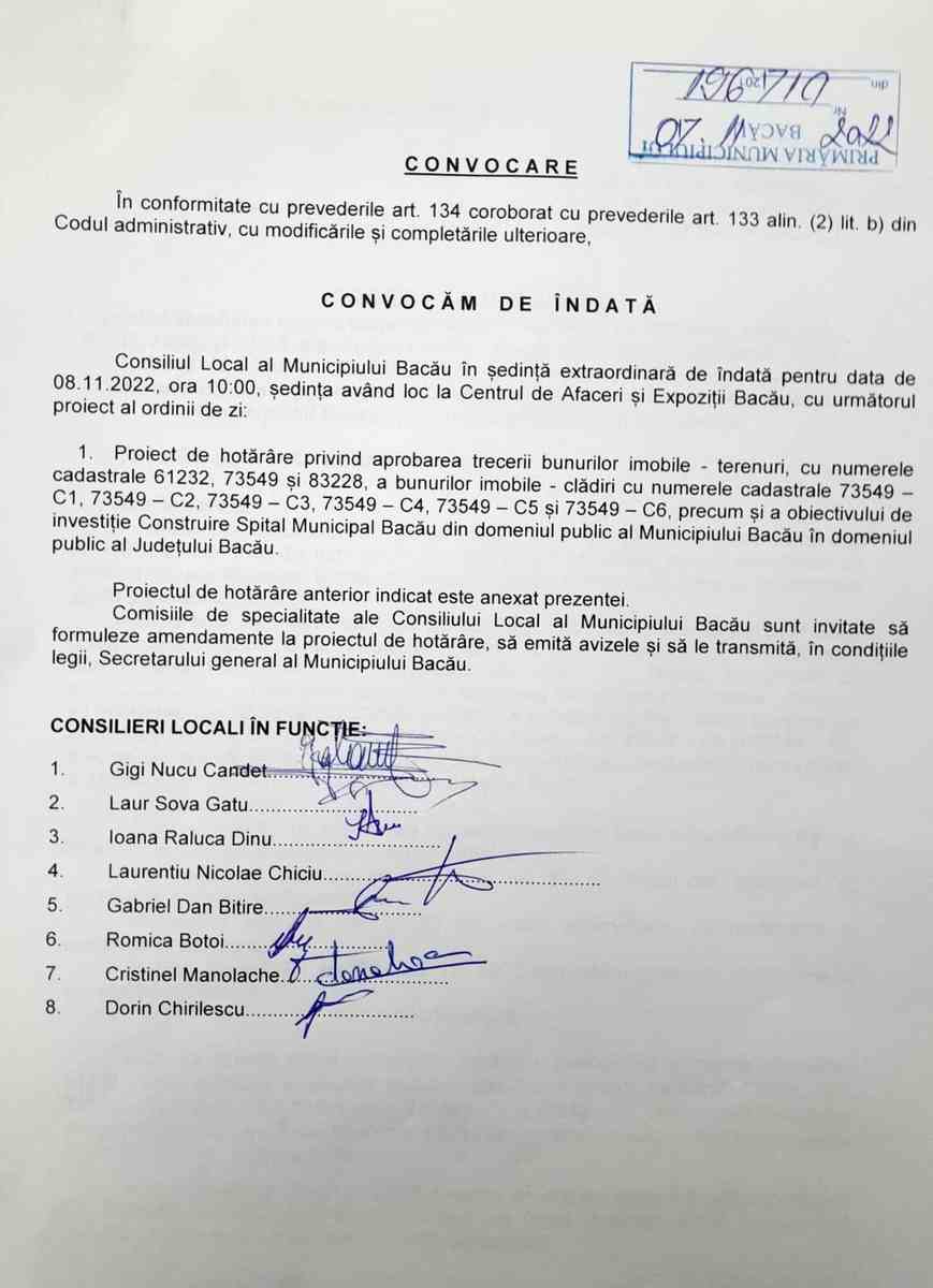 Opt consilieri locali băcăuani au semnat convocarea unei ședințe „de îndată” pentru a rezolva situația Spitalului Municipal, unitate medicală care a fost desființată juridic pentru a fi comasată cu Spitalul Județean, dar al cărei statut a rămas blocat de disputele politice.