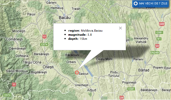 Un cutremur cu magnitudinea de 3,8 grade pe scara Richter s-a produs sambata dimineata, la ora 2:34, in Moldova, in apropierea localitatii Sascut, informeaza Institutul National pentru Fizica Pamantului (INFP). Seismul a avut loc la o adancime de 15 kilometri, potrivit datelor inregistrate pe site-ul INFP. Orasele apropiate de locul unde s-a produs cutremurul sunt Adjud (16 de kilometri), Onesti (20 km), Targu Ocna (34 km), Marasesti, (39 km) si Bacau (41 km), conform sursei citate. Anul acesta, in zona seismică Moldova a mai avut loc un cutremur, cu magnitudine mai mare de 4 grade. Acesta s-a produs pe 6 martie si a avut 4,2 grade pe scara Richter. De asemenea, tot in zona Sascut s-a mai produs, in urma cu aproximativ 10 zile, un seism cu magnitudinea de 2,8 grade pe scara Richter, la o adancime de 18 km.