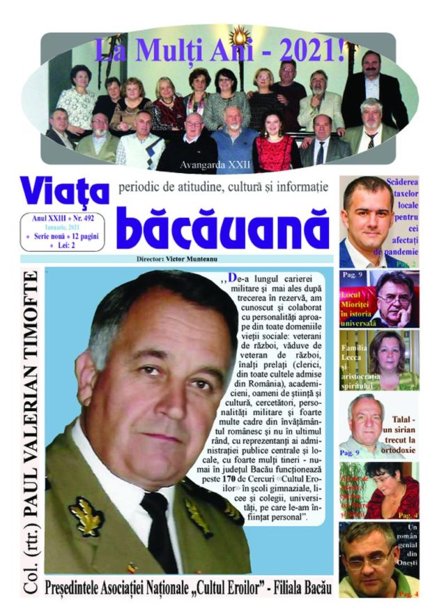 Mai aflăm că Gabriel Gavrilaș, un român genial din Onești, premiat cu aur în 2014, la Iaşi, la EUROINVENT, a creat un generator electric ce funcționează cu apă, iar Lucian-Daniel Stanciu Viziteu, primarul Bacăului, informează că „în anul 2021 voi scădea taxele locale pentru cei mai afectați de pandemie” și că „Nu sunt și nu voi fi de acord niciodată cu numirile politice în fruntea instituțiilor de învățământ! O spun răspicat, pentru a înțelege toată lumea!”. Petre Done semnează un portret cu Talal Hamag Al-Essa, medic sirian trecut la Ortodoxie, viceprimar al Comunei Măgura, Maria Dohotaru scrie o ,,lecție de istorie” cu Ștefan cel Mare, iar prozatoarea Cornelia-Ichim Pompiliu face o frumoasă cronică la cartea lui Dumitru Lecca, „Cronica unei mari familii băcăuane, boierii Lecca”, lansată astă toamnă la „Balta Albastră”.