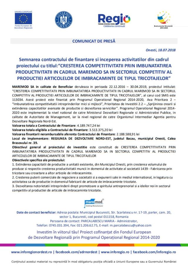 Semnarea contractului de finantare si inceperea activitatilor din cadrul proiectului cu titlul:“CRESTEREA COMPETITIVITATII PRIN IMBUNATATIREA PRODUCTIVITATII IN CADRUL MAREMOD SA IN SECTORUL COMPETITIV AL PRODUCTIEI ARTICOLELOR DE IMBRACAMINTE DE TIPUL TRICOTAJELOR”