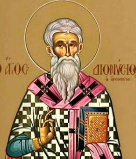 Sfântul Dionisie Areopagitul s-a născut în Atena. După ce a finalizat studiile de filosofie din Atena, a mers în Egipt pentru a și le desăvârși. Pe când se afla aici, Mântuitorul era răstignit pe Cruce la Ierusalim. Observând întunecarea cerului petrecută la moartea lui Hristos, a rostit profetic cuvintele: „Sau Dumnezeu pătimește sau lumea această văzută se sfârșește”. Dionisie revine în Atena și se bucură de întâlnirea cu Pavel în Areopag.