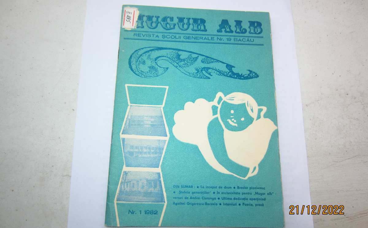 Cel din urmă cu patru decenii include în 30 de pagini A5 argumente ale bogăţiei limbii române şi ale binefacerilor culturii: „Să căutăm pentru lectura cu adevărat utilă nu cărţi, ci opere” (Constantin Ciopraga), „Toate apele largi ale acestui pământ/ izvorăsc din geografie şi se varsă-n istorie” (Andrei Ciurunga, într-un poem scris special pentru „Mugur alb”), „Eu cred într-o libertate responsabilă” (Victor Socaciu, intervievat de Ovidiu Popovici). Pe coperte se află ultima dedicaţie acordată de Agatha Grigorescu-Bacovia: „Elevilor Şcolii Generale Nr. 19 din Bacău, cărora le doresc succes în munca didactică şi cea artistico-literară. Amintire din timpul Centenarului George Bacovia. Agatha Grigorescu-Bacovia/ 25 sept. 1981” şi un salut al lui Radu Beligan, fost elev al acestei şcoli, pentru care învăţătorii din interbelic erau „vrăjitori blajini”, iar banca de învăţăcel, „locul mirajului inepuizabil de a cunoaşte”. În celelalte numere, din 1984 şi 1987, pot fi găsite afirmaţii-cadru aparţinând altor foşti elevi ai Şcolii de Băieţi Nr. 2 Bacău, cum se numea la început: Marius Mircu, Ariton Vraciu, Solomon Marcus, George Bălăiţă, Ovidiu Genaru, Eugen Uricaru, Marcel Marcian ş.a.