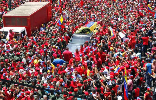 Mii de oameni s-au aliniat pe strazi pentru a atinge dricul care a transportat sicriul lui Hugo Chavez de la Academia Militara, unde acesta a fost depus timp de 10 zile. Cei mai multi dintre sustinatorii lui sunt imbracati in rosu, culoarea miscarii politice a fostului conducator al Venezuelei. Chavez, care a condus timp de 14 ani Venezuela, a murit de cancer saptamana trecuta. Ceremonii religioase si politice au avut loc la Muzeul Militar, la care au participat succesorul ales al lui Chavez, Nicolas Maduro. Aici, sicriul a fost primit de catre o garda militara de onoare. Corespondentul BBC Avraam Zamorano a precizat ca inca nu s-a luat o hotarare pe termen lung in privinta corpului neinsufletit al lui Chavez.