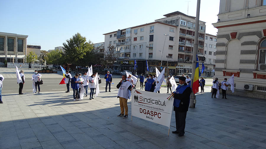 Problemele angajaților de la Direcția Generală de Asistență Socială și Protecția Copilului Bacău sunt departe de a fi încheiate. Salariații DGASPC nu și-au primit drepturile salariale pe luna septembrie, bani ce ar fi trebuit să-i primească în 10 octombrie. Astfel, membrii Sindicatului Salariaților din Asistență Sociala DGASPC Bacău, afiliat PUBLISIND, au protestat, astăzi, din nou, în fața Palatului Administrativ.