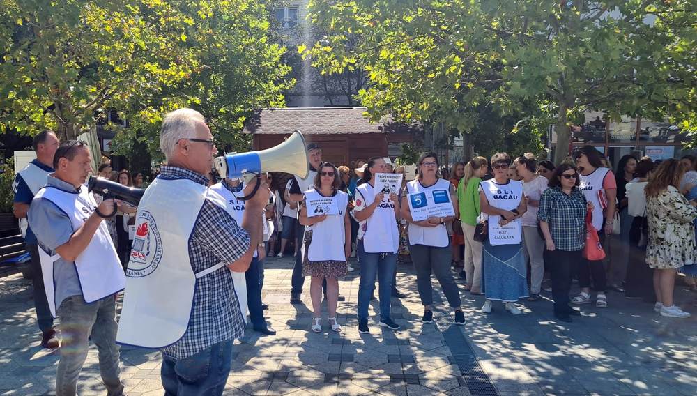 Profesorii și angajații din sistemul de educație au organizat astăzi un nou protest în fața clădirii goale a Prefecturii, aflată în renovare, situată în Piața Tricolorului.