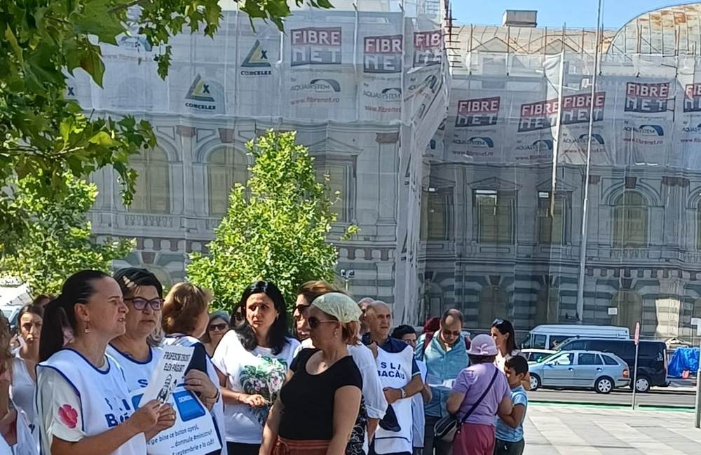 Profesorii și angajații din sistemul de educație au organizat astăzi un nou protest în fața clădirii goale a Prefecturii, aflată în renovare, situată în Piața Tricolorului.