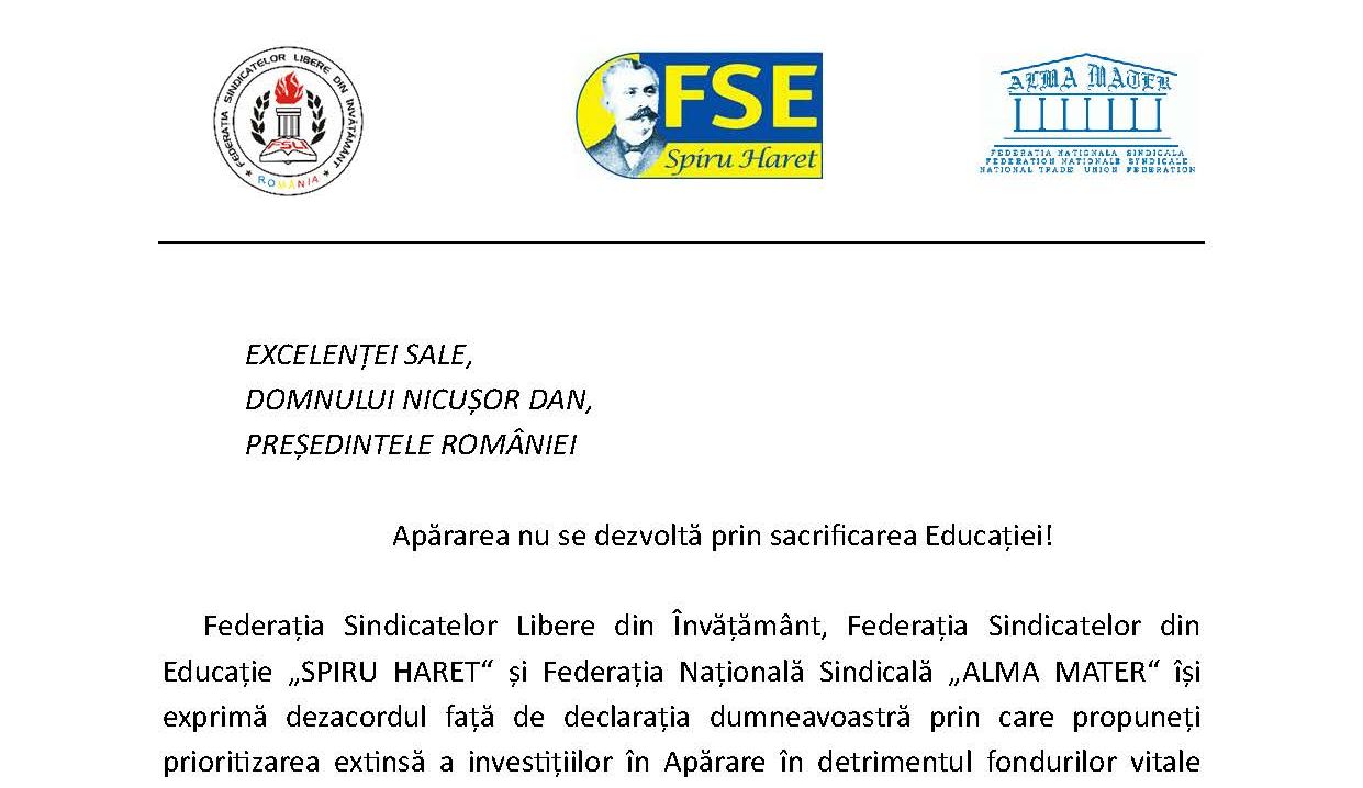 Federațiile sindicale din învățământ i-au transmis Președintelui Nicușor Dan un avertisment clar, cerându-i să retragă declarația prin care propune prioritizarea investițiilor în Apărare în detrimentul Educației și Sănătății. Într-o scrisoare deschisă, organizațiile califică această abordare drept „inacceptabilă” și subliniază că subminează cadrul legal.