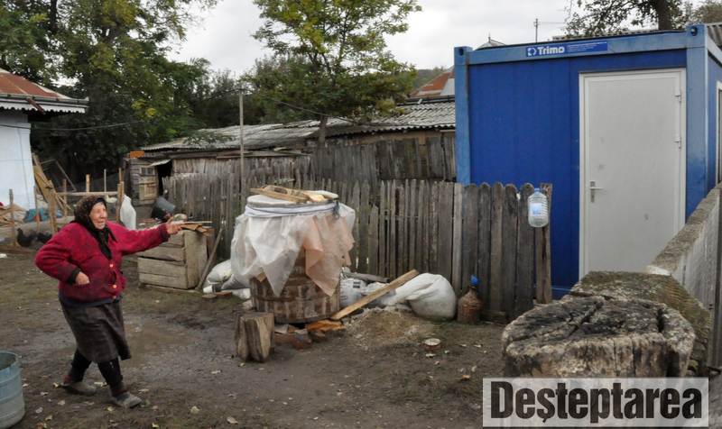 Autoritatile i-au adus acel container albastru, de fapt o locuinta modulara provizorie, in care are un pat, o masa, sub masa sunt intinse niste gogonele, intr-un colt e un vraf de haine, paturi si alte bulendre, o butelie, icoane, un ceas si alte câteva lucruri. Tot avutul ei. Nu exista nici o sursa de incalzire, e frig tare in container, iar singurul avantaj este ca nu te bate vântul taios.
