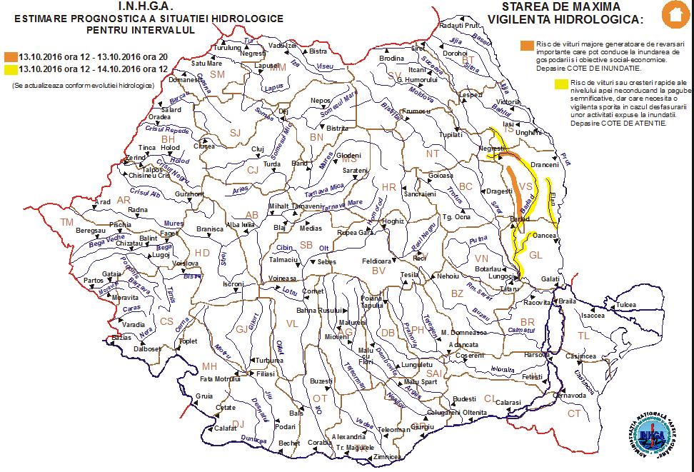 Având în vedere situaţia hidrometeorologică actuală şi prognoza meteorologică pentru următoarele 24 de ore, se actualizează avertizarea hidrologică emisă anterior. Astfel, se menține COD GALBEN în intervalul 13.10.2016 ora 12:00 – 14.10.2016 ora 12:00 pe râurile din bazinele hidrografice: Bârlad şi afluenţi (judeţele Iaşi, Vaslui, Bacău, Vrancea şi Galaţi).