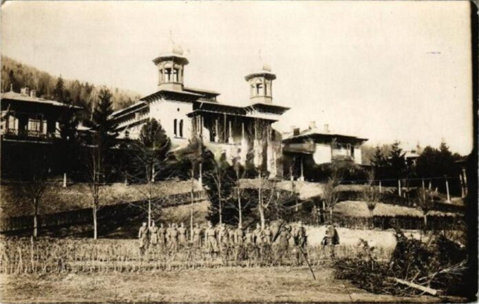 În fotografie, se poate vedea un grup de soldați maghiari în uniforme militare de epocă, în fața Cazinoului din Slănic-Moldova, capturată în anul 1917.