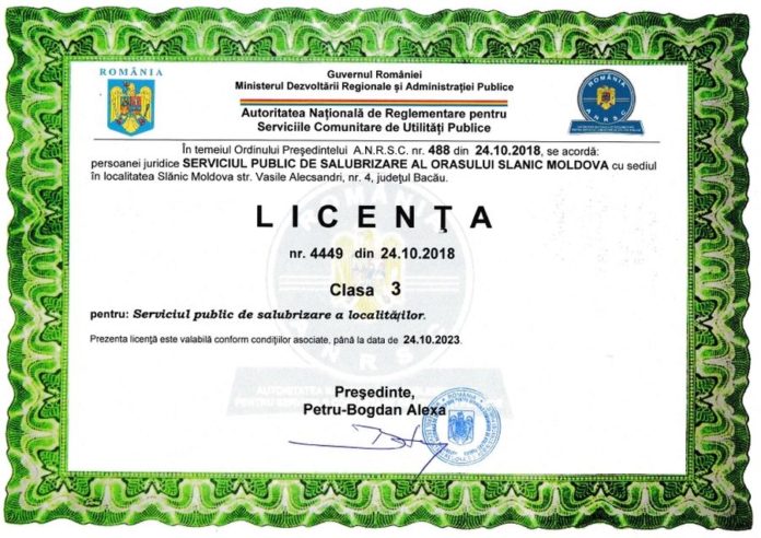 Autoritatea Națională de Reglementare pentru Serviciile Comunitare de Utilități Publice (ANRSCUP) a emis licența pentru Serviciul public de salubrizare al orașului Slănic Moldova. Licența este valabilă timp de cinci ani.