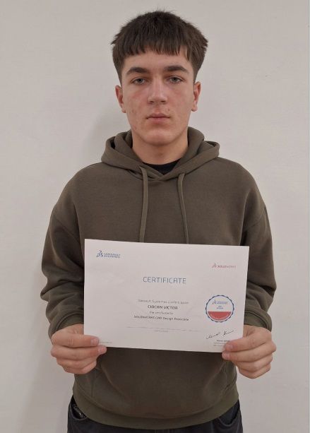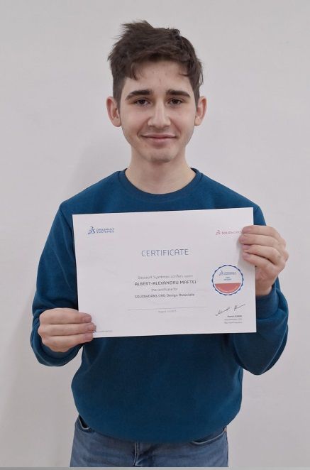 “Salut! Sunt Maftei Albert-Alexandru, elev în clasa a 12-a, și am reușit să obțin certificarea CSWA (Certified SolidWorks Associate), ceea ce a fost un pas important pentru mine în drumul către o carieră în inginerie și design 3D. Sunt extrem de pasionat de robotică și mă implic activ în proiecte și competiții care mă ajută să învăț mai multe despre construcția și programarea roboților. Îmi place să rezolv probleme complexe și să îmbunătățesc constant abilitățile mele tehnice, iar visul meu este să contribui la dezvoltarea tehnologiei într-un mod inovator.”