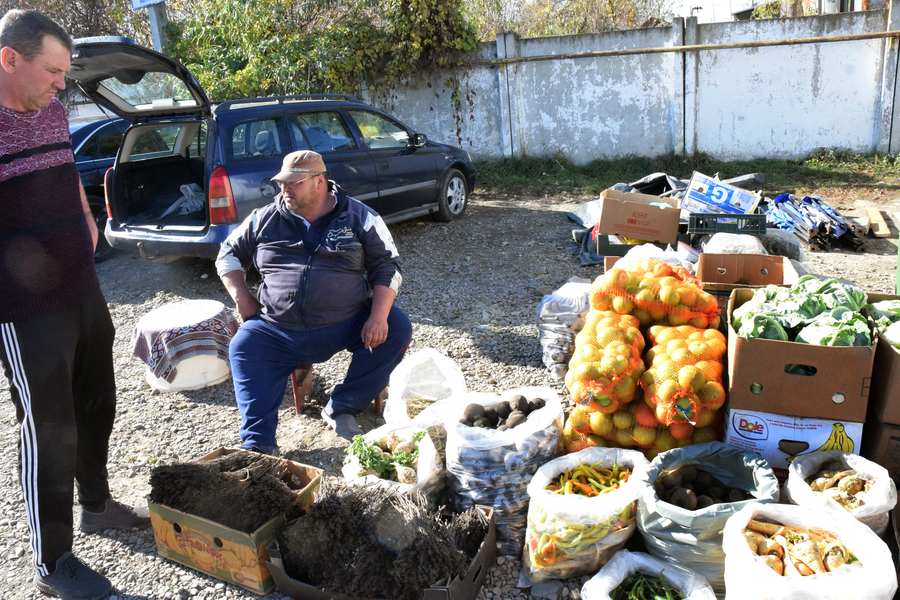 După un slalom printre mașinile cu portbagajele căscate, primitoare de saci din rafie umpluți cu de toate, un zâmbet mascat de ochelari și șapcă, asortat cu o bluză albastră de trening, așteaptă. Mi-a citit traiectoria. După cum studiam terenul și la cum era organizat standul lui, nu se putea să nu mă opresc: