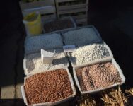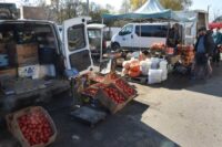 La nici zece metri distanță, suficient să te împiedici în ofertele de saci cu ceapă și cartofi – sunt multe mașini parcate – patru mânuțe fac semn să le pozez. I-au prânzul cu poftă, din ceva învelit în hârtie, supraveghind în același timp locul de muncă, servind și clienții. Masa-i pe furate. În incinta Târgului de Gross există o mică locație, unde poți să dai comandă pentru o gustare. Dacă plouă, ca și client, poți sta la o bere sau un suc sub copertină. Standul „mânuțelor” este bine garnisit, ca aproape toate roadele toamnei să se afle la vânzare pe tarabă. Situat lângă hala de depozitare, poți presupune că au și ce oferi a doua zi. Aici spațiile sunt închiriate în funcție de cantitatea de produse, multe aduse de la sute de km distanță. Vorbim: