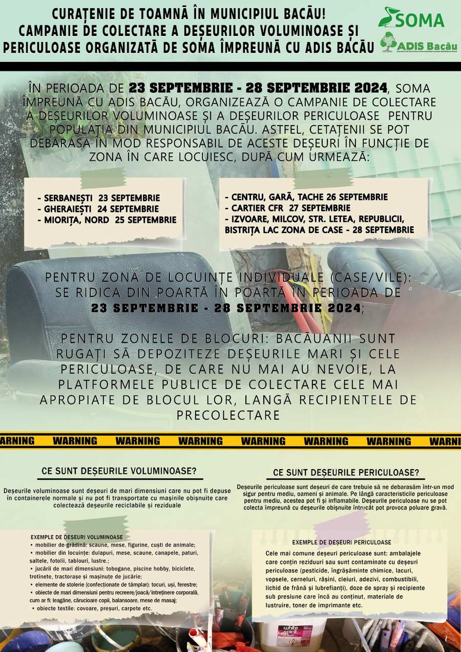 Bacău, 17 septembrie 2024 – SOMA Salubrizare, în colaborare cu ADIS Bacău, demarează o amplă campanie de colectare a deșeurilor voluminoase și periculoase din municipiul Bacău. Acțiunea are scopul de a ajuta cetățenii să scape responsabil de obiectele nefolositoare din gospodării, pregătindu-se astfel pentru sezonul rece.
