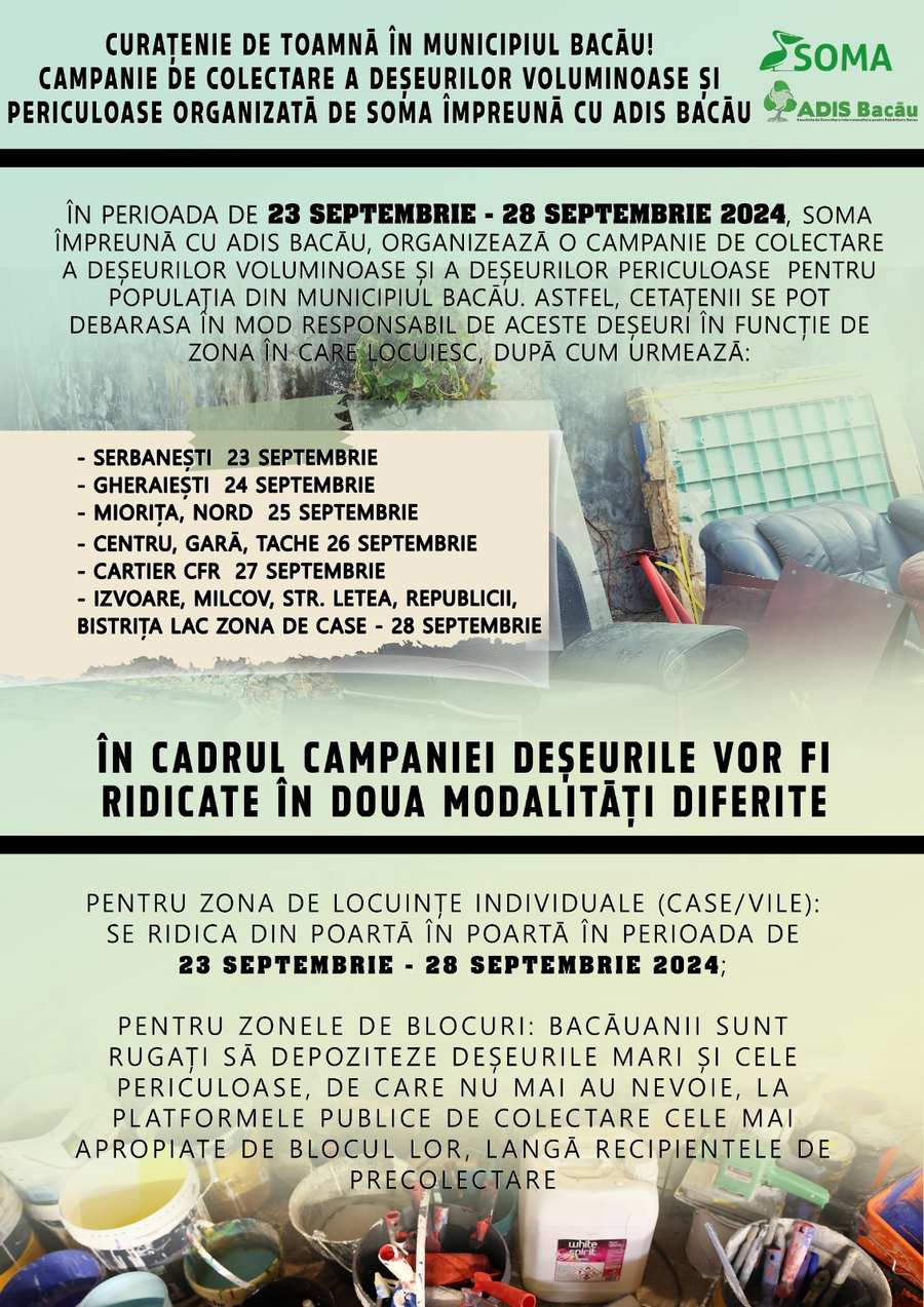 Această campanie de toamnă este parte a eforturilor constante ale SOMA Salubrizare și ADIS Bacău de a îmbunătăți gestionarea deșeurilor și de a încuraja comportamentele responsabile față de mediul înconjurător.
