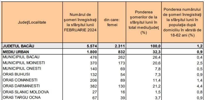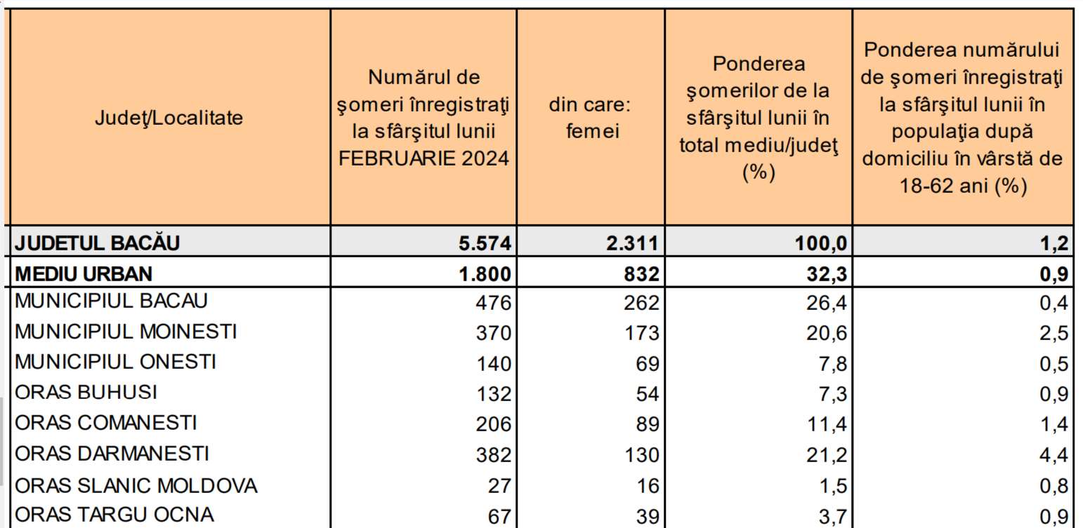 Slănic Moldova are cel mai mic număr de șomeri din mediul urban, iar femeile constituie majoritatea, cu 59,3%.