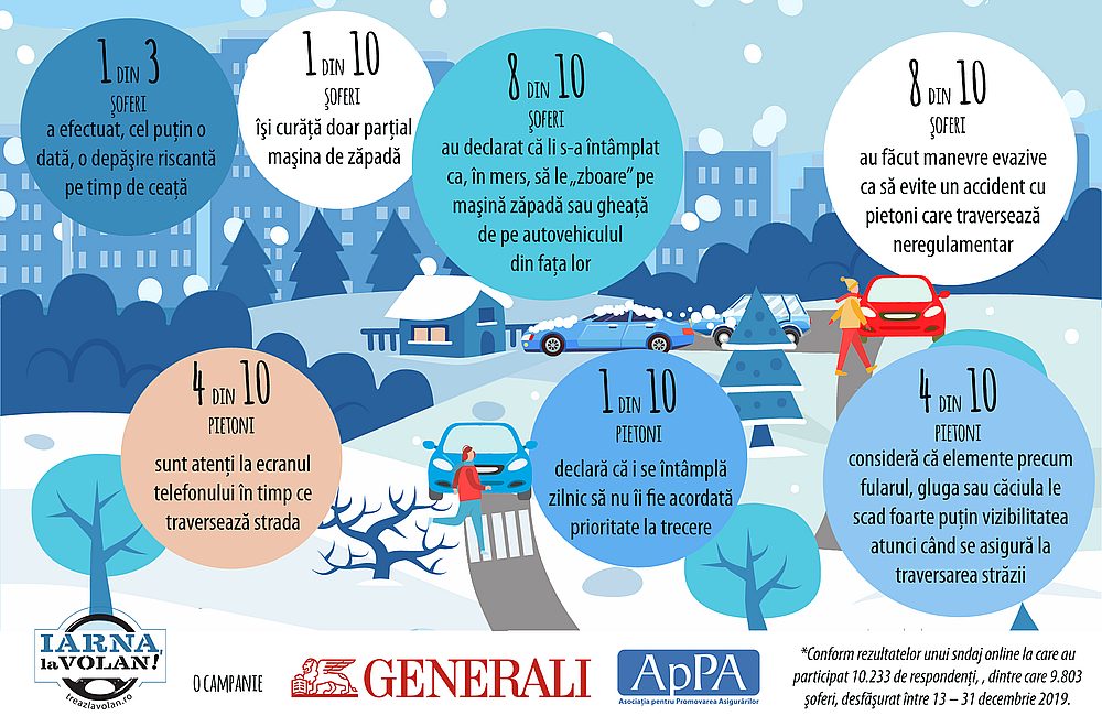 Sondajul a fost realizat în cadrul campaniei naţionale de siguranţă şi prevenţie rutieră „Iarna, la volan”, desfăşurată, pe întreaga durată a lunii decembrie 2019, de GENERALI România şi APPA – Asociaţia Pentru Promovarea Asigurărilor, şi a avut ca obiectiv să evalueze comportamentele din trafic ale şoferilor şi ale pietonilor, în special în sezonul rece, dar nu numai.