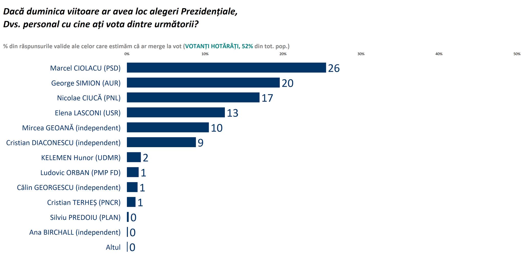 Competiția pentru cel de-al doilea loc în finala electorală este, însă, mult mai tensionată. George Simion, liderul Alianței pentru Unirea Românilor (AUR), se bucură de un sprijin de 20% din partea electoratului, însă la doar trei puncte procentuale distanță se află Nicolae Ciucă, candidatul Partidului Național Liberal (PNL), cu 17%. Această cursă strânsă între Simion și Ciucă promite să fie punctul culminant al campaniei, creând un suspans care va atrage atenția până în ultima zi de campanie.