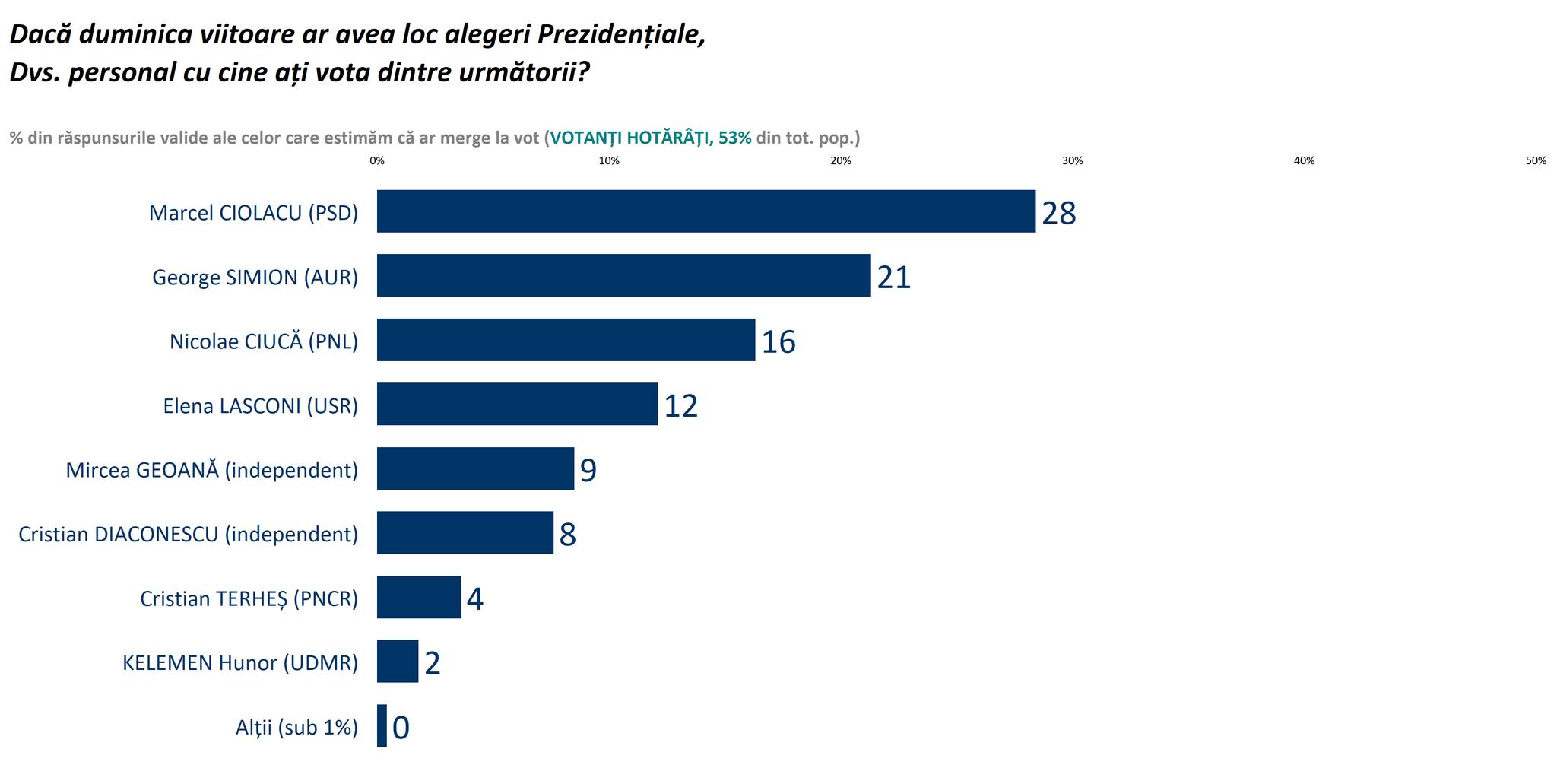 În timp ce locul întâi este dominat de Ciolacu, competiția pentru locul doi este extrem de disputată, între George Simion (AUR) și Nicolae Ciucă (PNL). Simion se situează în sondaje pe locul doi, cu un scor de 21%, în timp ce Ciucă este la o distanță de cinci puncte procentuale, având 16% din intențiile de vot.