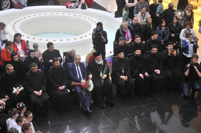 Inainte de intrarea in “arena” a solistilor si formatiilor artistice, in spatiul de la parter, din jurul fântânii arteziene, pâna la ultimul etaj, numerosi bacauani, femei si barbati, impreuna cu cei mici, asteptau cu emotie sosirea Inaltpreasfintitului Ioachim, a carui prezenta a fost anuntata de organizatori. Insotit de un grup de preoti, inaltul ierarh al bisericii ortodoxe a oferit flori tuturor femeilor venite la spectacol sau aflate in trecere, gest imbogatit de urarile de multi ani, cu sanatate si credinta, dupa care a luat loc, alaturi de protoiereul Constantin Busuioc si patronul Mall-lui, Ovidiu Budeanu, venit impreuna cu mama sa, in spatiul amenajat pentru oaspeti. Am urmarit cu interes evolutia artistilor, dar si atmosfera din marele complex bacauan, oferindu-va, si noi, cele mai sugestive imagini.