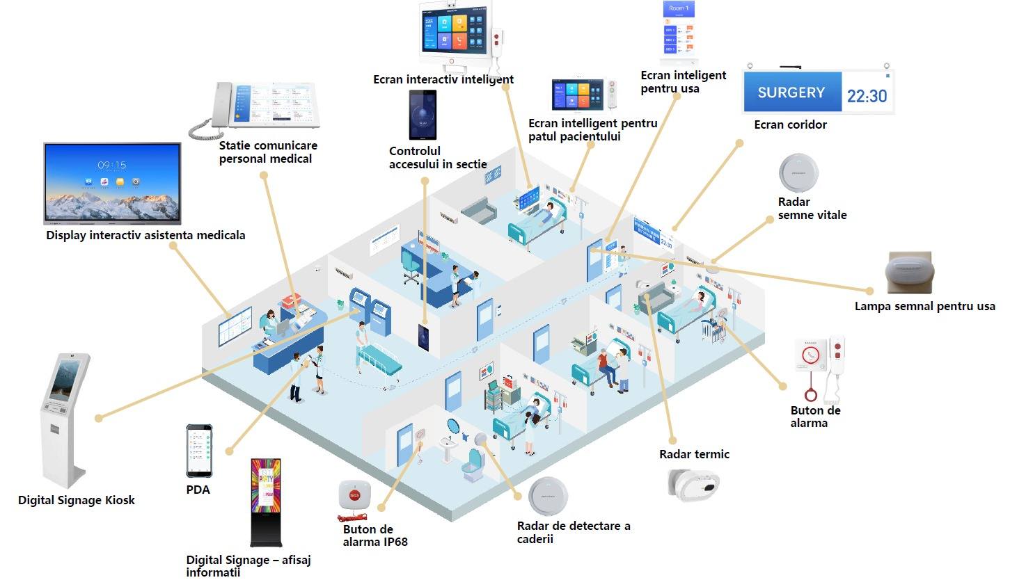 Tabletă inteligentă pentru fiecare pat – permite accesul pacienților la informații medicale, apeluri directe către asistenți și notificări în timp real;