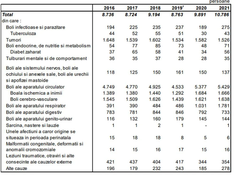 Dar, decesele cauzate de boli ale aparatului circulator au explodat, de la 4.533 în 2019, la 6377 în 2020, respectiv, 5.429 în 2021. Boala ischemică a inimii a avut cea mai mare contribuție: de la 1292 de decese în 2019, la 1666 în 2021, o creștere de 29%.