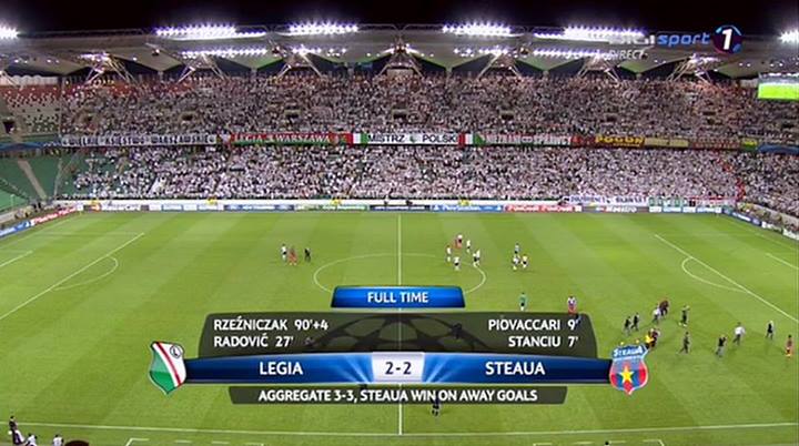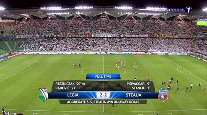 Invitată de Steaua, Legia a luat conducerea jocului şi a început să pună presiune, iar în minutul 20 Kucharczyk a trimis balonul în plasă, dar golul a fost anulat pentru o poziţie de ofsaid.