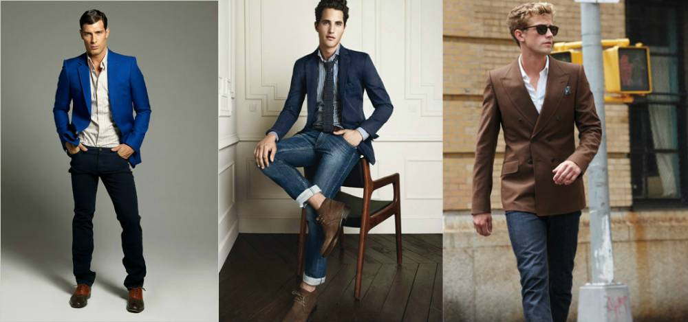 Pantalonul de jeans trebuie purtat la constum doar dacă se alege nuanța corectă și croiul adecvat, care să permită o bună armonizare cu restul ținutei. Există tot felul de stiluri și forme la pantalonii jeans, dar cei mai potriviți rămân totuși blugii drepți clasici pentru a fi asortați cu un sacou în vederea realizării unui stil casual elegant. La o astfel de ținută nu merg blugii evazați, cambrați și nici modelele cu aspect prespălat. Trebuie să se opteze pe un aspect elegant și nu pe un aspect cu blugi rupți.