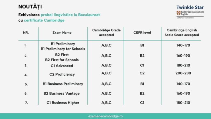 Conform ordinului 4796 publicat în Monitorul Oficial la începutul lunii septembrie, cei care vor să nu mai susțină proba de evaluare a competențelor lingvistice pot face acest lucru cu certificat de B1 Preliminary sau nivel superior în cadrul căruia a fost obținut calificativul A, B sau C.