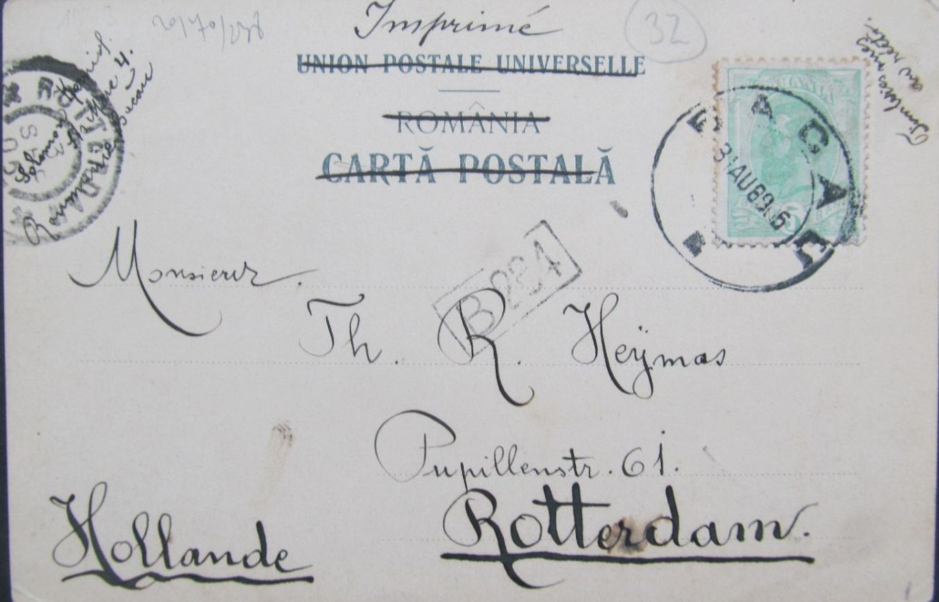 Această imagine pitorească a fost capturată cu grijă și transformată într-o carte poștală, o fereastră către viața cotidiană a Bacăului din acele vremuri. Prin intermediul corespondenței poștale, această vedere fascinantă a străzii comercianților a călătorit până în Rotterdam, purtând cu ea povestea unei comunități agitate și a unei perioade de schimbare și progres.