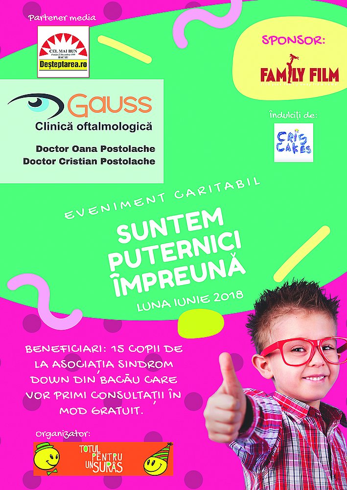 Empatia este mereu o soluţie. Acestă forţă, acest simţ al apartenenţei la un mare tot, ne îndeamnă să fim atenţi la nevoile celorlalţi. De aceea, Clinica Gauss Optic, prin amabilitatea doctorilor Oana Postolache şi Cristian Postolache, oferă în luna iunie a acestui an consultaţii personalizate, în mod gratuit copiilor şi tinerilor cu sindrom Down, beneficiari ai Asociaţiei Sindrom Down Bacău a cărei preşedinte este Gabriela Oteliţă.