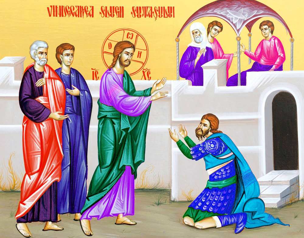 În logica acestei mărturisiri ne este adusă înainte, spre înțelepțire, pilda centrală a Evangheliei de astăzi (Matei. 8, 5-13), care ne vorbește despre ispită, și, mai ales, despre puterea vindecătoare a Fiului lui Dumnezeu înomenit. La intrarea în cetatea Capernaumului, Domnul este întâmpinat de un sutaș neevreu. Deși soldat în armata de ocupație, omul, smerit și cumpătat, cere har de vindecare. Nu cu emfază, nu cu aroganță, nici cu pretenția de a face rău: ”Doamne, sluga mea zace în casă, chinuindu-se cumplit”. Centurionul, slujbaș al Împăratului de la Roma, știe că funcția nu-l face mai responsabil și mai special. Înțelege că este pus să gestioneze o demnitate, nu să facă din ea începutul subjugării aproapelui. Hristos vede dincolo de barierele de carne ale inimii și întreabă: „Crezi tu că pot să fac Eu asta?”. Iar răspunsul „Cred, Doamne, ajută necredinței mele!” vindecă. Pentru că stăpânul știe a reda demnitatea semenului prin chemarea în ajutor a lui Dumnezeu. Este interesant de arătat faptul că verbul expresiei: ”Fie ție!” mai este întâlnit în Biblie doar într-un important moment mântuitor, la Buna Vestire. Atunci este rostit de Maică, acum el aparține Fiului.