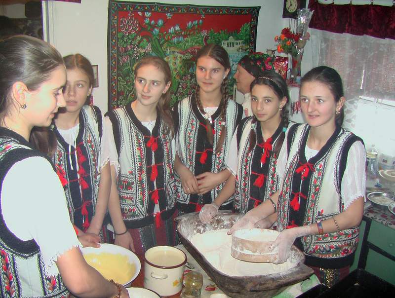 Apropo de oua, acestea se vopsesc in joia mare, cu modele de frunzulite, in vopseluri naturale, vegetale: foi de ceapa pentru galben, pelin pentru gri, coji de nuca pentru nuante de maro si combinatii din acestea pentru rosu sau alte nuante. Mielul este la mare pret si din el se face friptura, dar mai ales o delicioasa pastrama, atârnata la zvântat de grinda, in camara. „Am patru oi la stâna si fiecare a fatat câte doi miei, ca niciodata. Va fi an bogat!”, spune, bucuroasa, invatatoarea Creanga. Despre preparate de porc nu se vorbeste, fiindca foarte putini sunt cei care cresc râtani pe lânga casa.