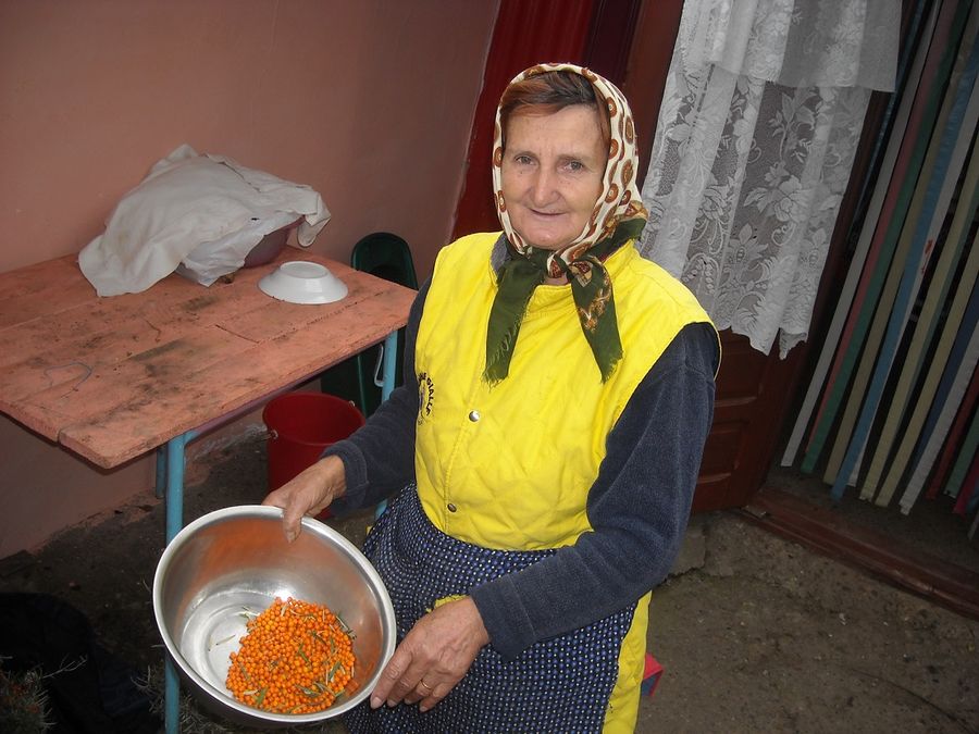 Făcând o scurtă radiografie a treburilor țăranilor din această perioadă, am spune că oamenii sunt ocupați cu făcutul conservelor, cu strânsul porumbului și al strugurilor. Ei bine, pe Magdalena Ghebu, din Sascut Sat, comuna Sascut, am găsit-o adunând cu migală boabe de cătină. Femeia fusese la primele ore ale dimineții să strângă crenguțe de cătină, pline cu boabe mici, portocalii, coapte. Tufele de cătină nu sunt deloc prietenoase, fructele fiind greu de cules din cauza țepilor de pe crenguțe. Așa că, Magdalena Ghebu, a luat foarfeca de vie și o haină veche din care a încropit un “scut” pentru a putea aduce cătina acasă.