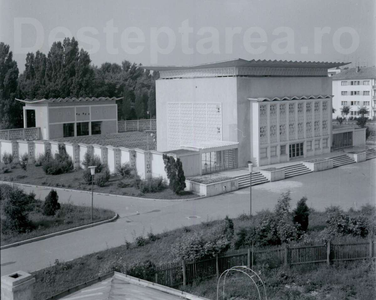 Teatrul de Vară din Bacău, fotografiat aici în anii ’70, reprezenta un veritabil simbol al vieții culturale și sociale a orașului. Construit cu arhitectura specifică perioadei, acest loc neacoperit era destinat organizării de concerte și proiecții de filme în aer liber, devenind un punct de atracție esențial pentru locuitorii orașului pe timpul verii.